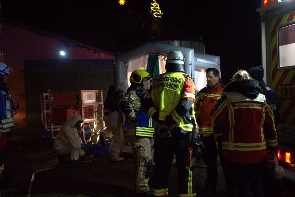 Nur die Planer der Alarmübung am 05.12.2025 ab 18:13 Uhr waren in den Ablauf eingeweiht. Vom Löschzuggefahrgut Herzogtum Lauenburg wurde im Oktober die Anfrage nach einer gemeinsamen Übung an uns herangetragen. Da dieses auch für uns als FF-Schulendorf nicht zum Alltagsgeschäft gehört, stimmten wir gerne zu. Die Lage stellte sich folgendermaßen dar, bei Aufräumarbeiten wurden Pakete mit radioaktiven Inhalt gefunden , die dann einen Einsatz der FF-Schulendorf und dem LZG Herzogtum Lauenburg auslösten. Im Anschluss an die Übung mit ca. 40 Beteiligten Einsatzkräften sowie Statisten, gab es am Gerätehaus Schulendorf Grillwurst und Getränke, sowie eine Besprechung zum Ablauf der Übung, welche zu dem Ergebnis kam , das im Großen und Ganzen die Übung zufriedenstellend abgearbeitet wurde, jedoch in einigen Bereichen Verbesserungspotential besteht. Übungsende nach ca. 2 Stunden.