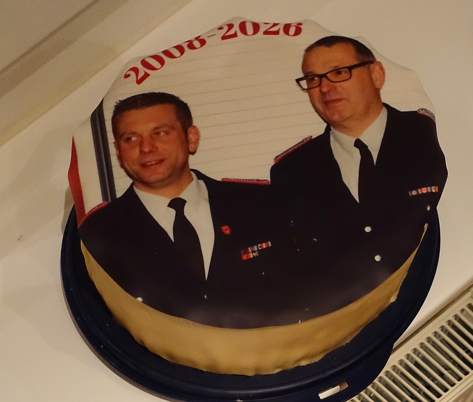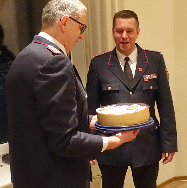 BM Henning Beck hörte nach 18 Jahren als Wehrführer bzw. als Stv. Wehrfüher auf. Wehrführer OBM Jörg Koch bedankte sich bei ihm mit einer Torte und blickte noch einmal auf Höhepunkte ihrer gemeinsamen Zusammenarbeit zurück, die da waren: jüngster Wehrführer im Kreis, 75 Jahre Jubiläum FF-Schulendorf, Anschaffung neues MLF 10/6, Anschaffung eines MZF, Anschaffung eines TSA , Beschaffung neuer Atemschutzgeräte sowie Beschaffung neuer Einsatzschutzkleidung.